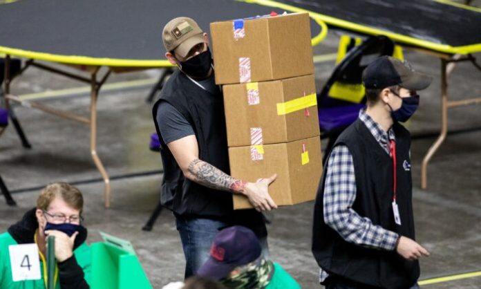PHOENIX, AZ - MAY 01: Contractors working for Cyber Ninjas, who was hired by the Arizona State Senate, examine and recount ballots from the 2020 general election at Veterans Memorial Coliseum on May 1, 2021 in Phoenix, Arizona. The Maricopa County ballot recount comes after two election audits found no evidence of widespread fraud. (Photo by Courtney Pedroza/Getty Images)