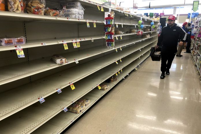 A shopper walks past empty shelves where bread is normally displayed in a supermarket, Sunday, March 15, 2020, in Boston. For most people, the new coronavirus causes only mild or moderate symptoms, such as fever and cough. For some, especially older adults and people with existing health problems, it can cause more severe illness, including pneumonia. The vast majority of people recover from the new virus. (AP Photo/Steven Senne)