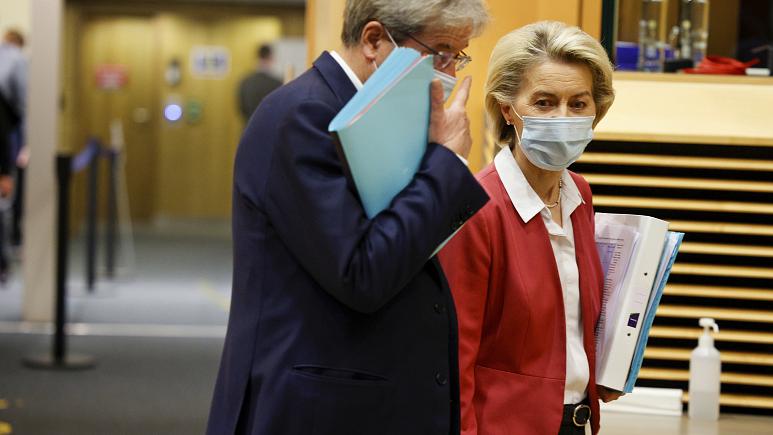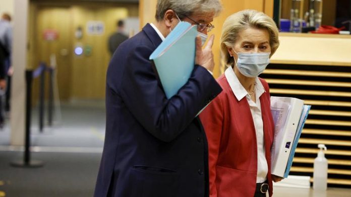 European Commissioner for Economics Paolo Gentiloni talks with President of the European Commission Ursula von der Leyen at the College of Commissioners in Brussels, Wednesday   –   Copyright  Olivier Matthys/Copyright 2021 The Associated Press. All rights reserved