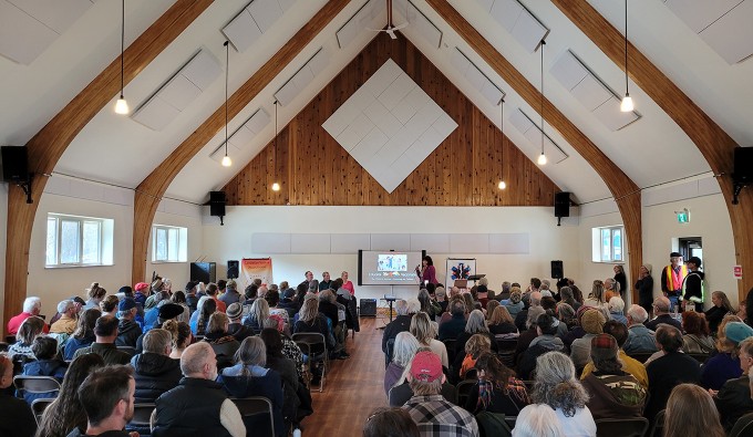 A crowd filled the North Shore Hall in Nelson Saturday to listen to Dr. Stephen Malthouse, Dr. Sophia Bayfield and Dr. Kevin Sclater explained reasons against vaccinating children. — Submitted photos