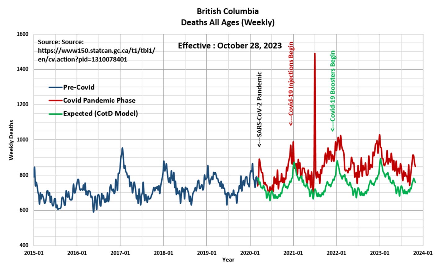The author of the CotD has combined analyses of Covid-19 and Excess Deaths (all causes) as these are related.  Refer to recent CotDs related to British Columbia March 9, 2024 (https://eldric.substack.com/p/special-edition-chart-of-the-day ) and September 25, 2023 (https://eldric.substack.com/p/chart-of-the-day-cotd-british-columbia-c05 ).