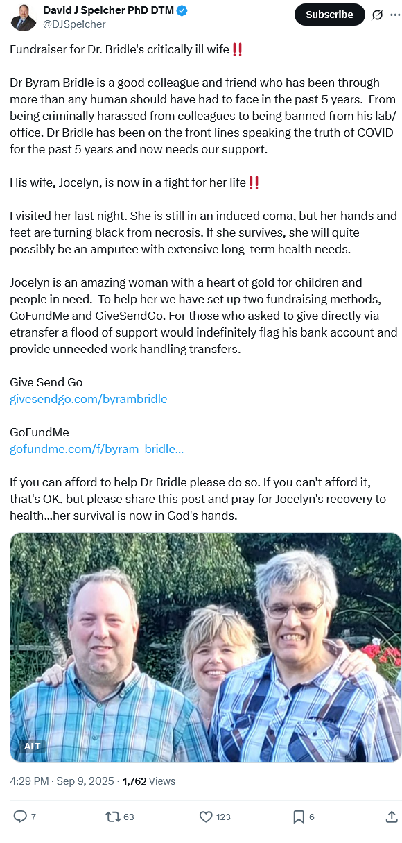 Dr Byram Bridle is a good colleague and friend who has been through more than any human should have had to face in the past 5 years. From being criminally harassed from colleagues to being banned from his lab/office. His wife, Jocelyn, is now in a fight for her life. She had a leg infection that went septic and has undergone surgery in an induce coma. He has been on the front line for all of us for the past 5 years and now needs our support. If you can afford to help Dr Bridle please do so. If you can’t afford it, that’s OK, but please pray for his wife’s recovery to health.