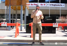 A Calgary police officer who spoke out against the mandates reads his resignation letter to Chief Mark Neufeld at the rally yesterday.